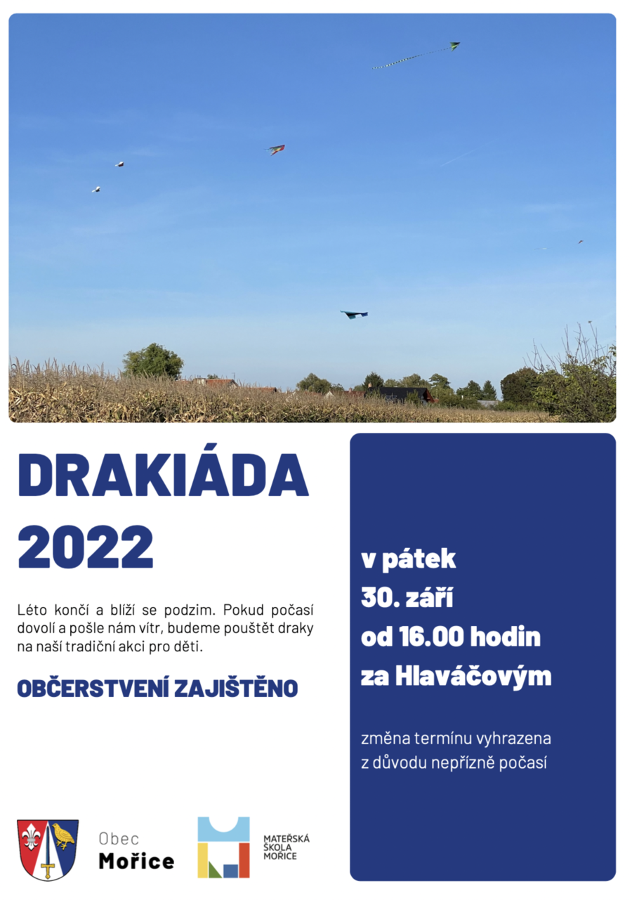 Tradiční podzimní akce pro děti je Drakiáda, kterou obec pořádá ve spolupráci s mateřskou školou. V Mořicích se konala i letos na cestě mezi poli pod dálnicí. Rodiče a děti se snažili pouštět draky své velké nebo malé papírové, výrobky dětí právě ze školky. Pro účastníky byla připravena sladká odměna. Vítr nám letos moc nepřál, přesto jsme se rádi sešli a zasmáli se společně. Trefně shrnula akci jedna mladá maminka: "Není umění udělat Drakiádu, když fouká, ale když nefouká." Vidíte, že si u nás nakonec se vším poradíme.